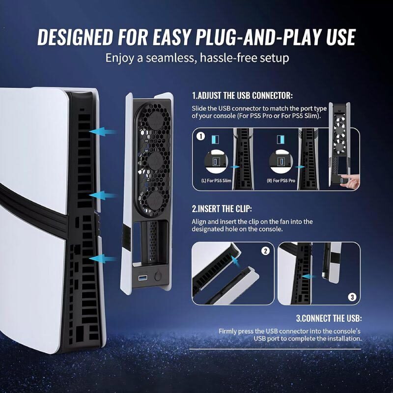 سه فن قدرتمند با قابلیت چرخش بالا، دمای کنسول رو تا ۸ درجه کاهش میده. نصبش فقط در چند ثانیه انجام میشه و نیازی به پیچگوشتی نداری.
